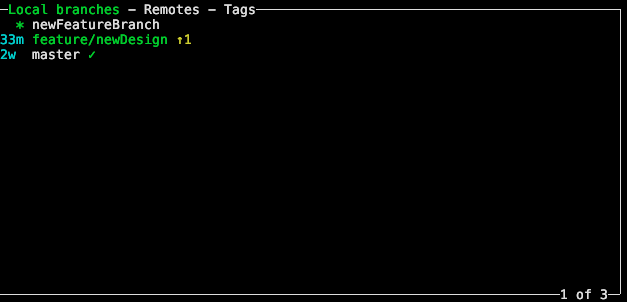 Now you have a new branch created from the previously checked-out branch. If you hit Space, you can checkout the branch, and this works for remote branches too.